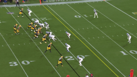 We head to Week 2’s Monday Night game as Green Bay Packers QB Aaron Rodgers throws what I consider the most impressive pass of the week to TE Rob Tonyan. Rodgers threads the needle in one of the smallest windows possible as Tonyan makes a break in his route. The throw is amazing, but Tonyan’s vision and quick ability to make the catch on this play impresses me just as much. He turns his head and the ball is coming at him hard and he is able to converge his eyes to get the quick-approaching pass as it sneaks past the defender's head.