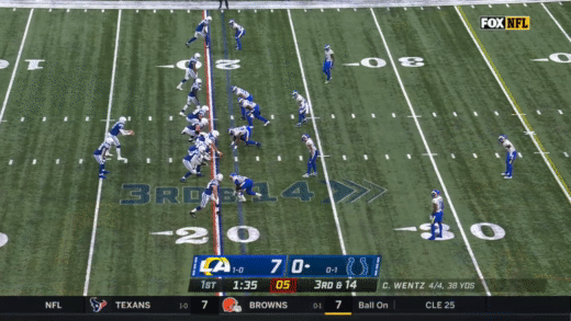 The first clip we’ll take a look at is this Week 2 play where Indianapolis Colts QB Carson Wentz connects on a deep ball to WR Michael Pittman. Wentz drops back and launches a prayer downfield to an open Pittman. Wentz connects on the 50+ yard pass as he gets leveled. Pittman starts inside the top numbers and heads downfield dragging across the field landing on the opposite side numbers. Pittman shows an excellent display of concentration and tracking as he looks the ball in as it travels through the air. Pittman has his head turned to track the ball as he drags across the opposite numbers while avoiding two defenders.